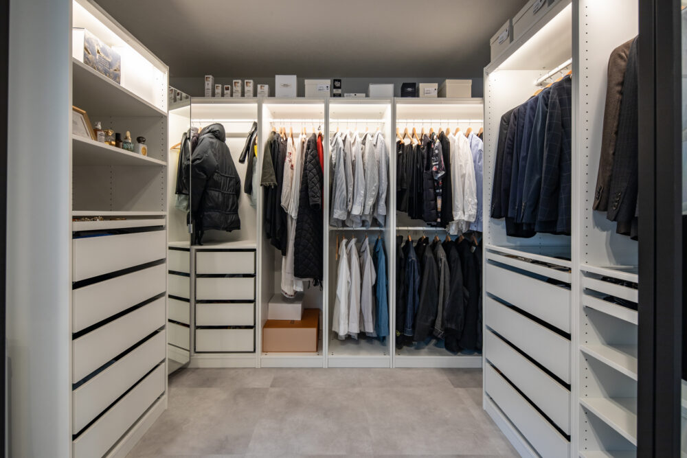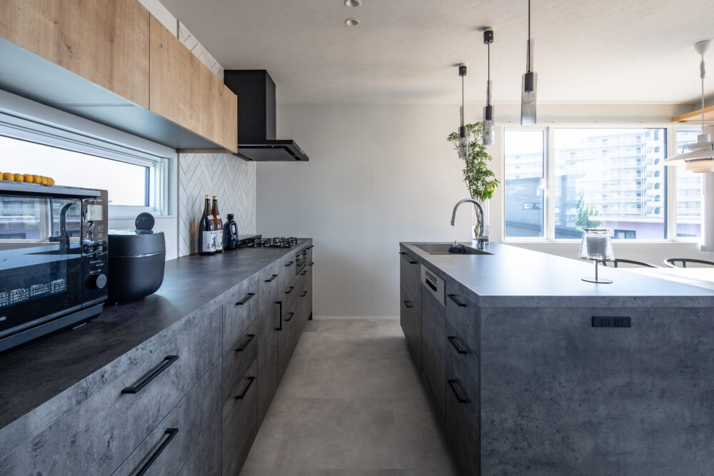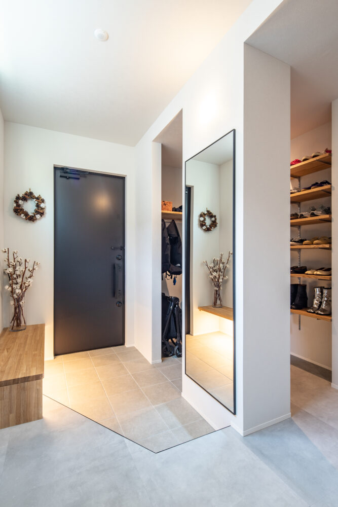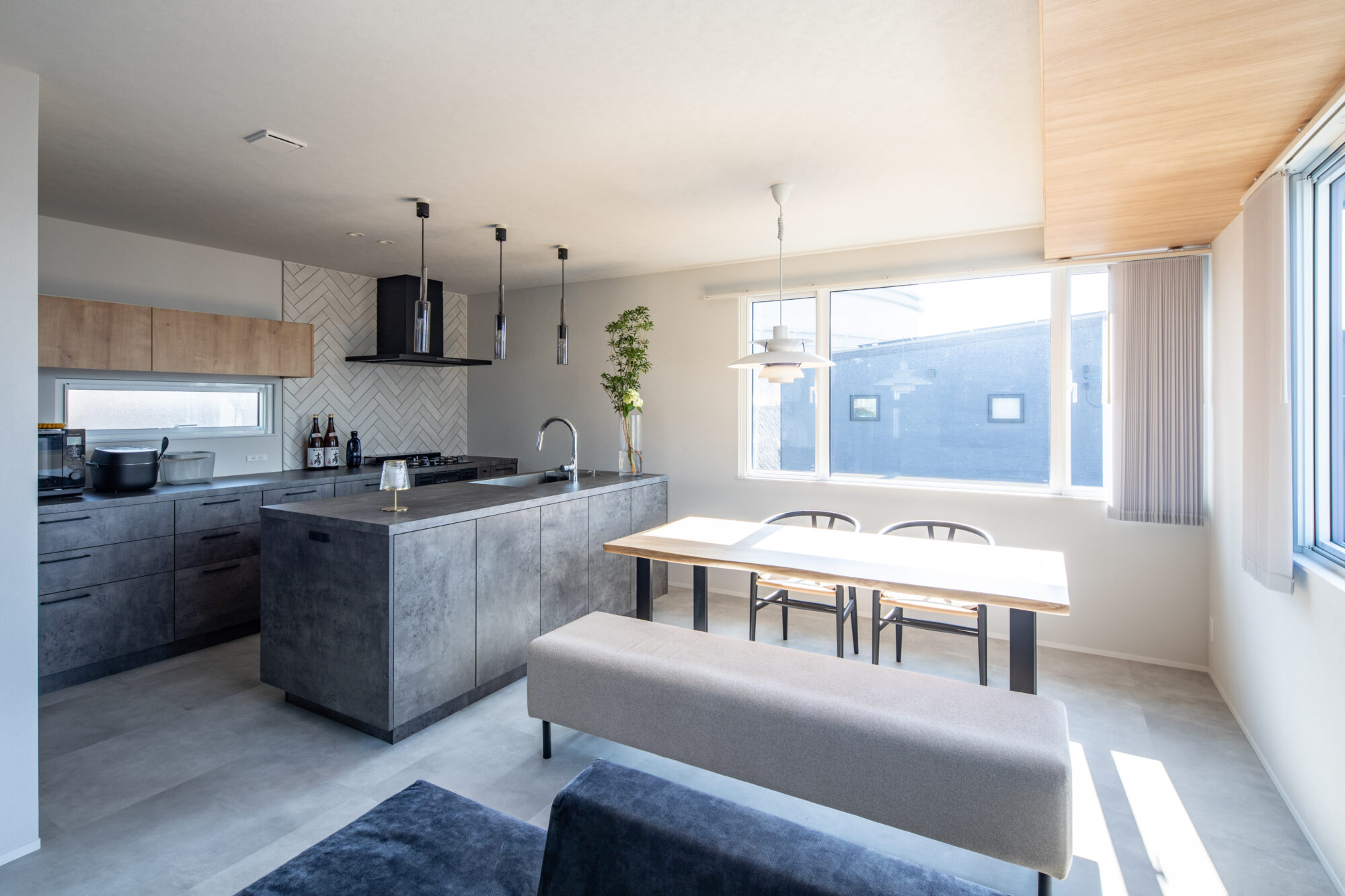高台に位置する土地なので、その良さを活かして2階リビングの住まいにしました。人目を気にせず暮らせるので、開放的に過ごせています。リビング照明にルイスポールセンを採用したり、TVボードを埋め込み極力凸凹を無くしたり…様々な工夫を取り入れたホテルライクな我が家。一番のこだわりは1FにあるWIC。夫婦2人ともファッションが好きなので、お気に入りの数々を「見せる収納」として飾っています。外構にもこだわり、駐車場を堀込車庫のようにし、その上をゆったりと使える庭に設計。友人たちとBBQもできそうです。